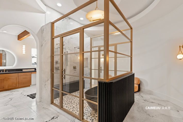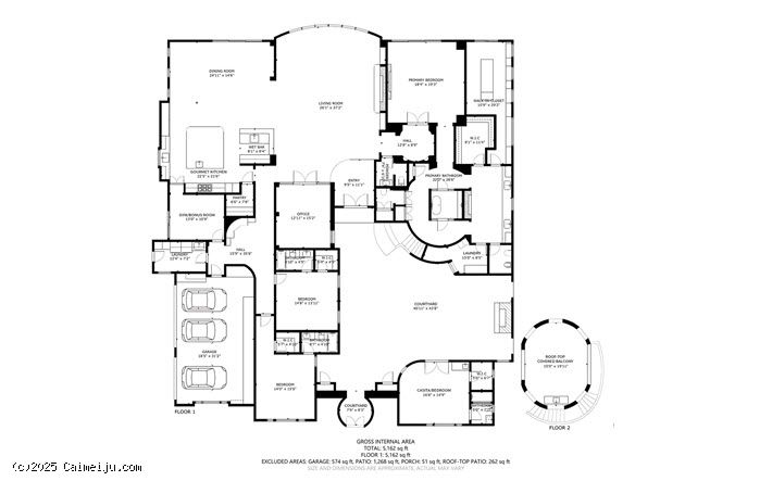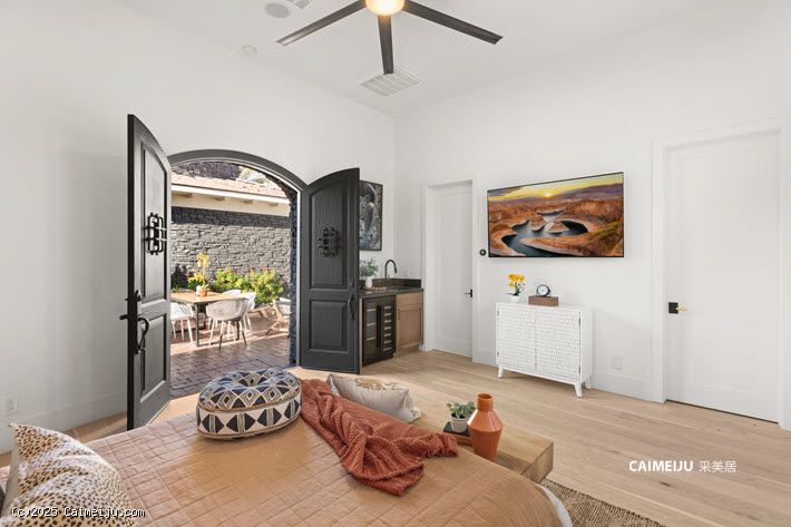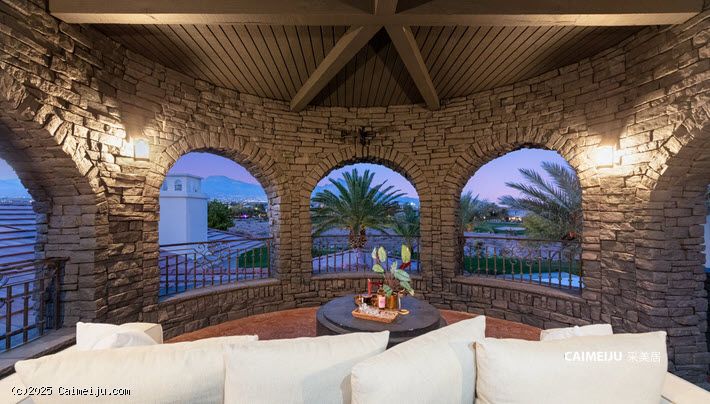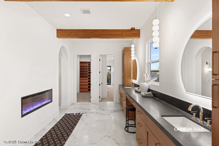 The separate casita offers a private retreat with kitchenette and bath. Inside, enjoy an elevated chef’s kitchen with custom maple wood cabinetry, designer surfaces, upscale appliances, double dishwashers, entertaining bar and lounge. The primary suite features a limestone fireplace, stackable sliders, dual custom closets and a spa-inspired wet room. A dramatic second-level stone turret reveals an open-air viewing loggia with panoramic vistas. Finished with hardwood floors, Level 5 interior, designer lighting, and custom details throughout.