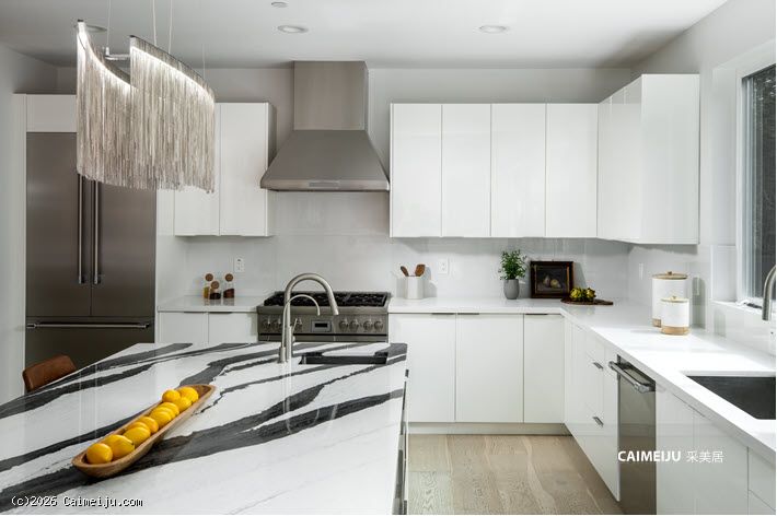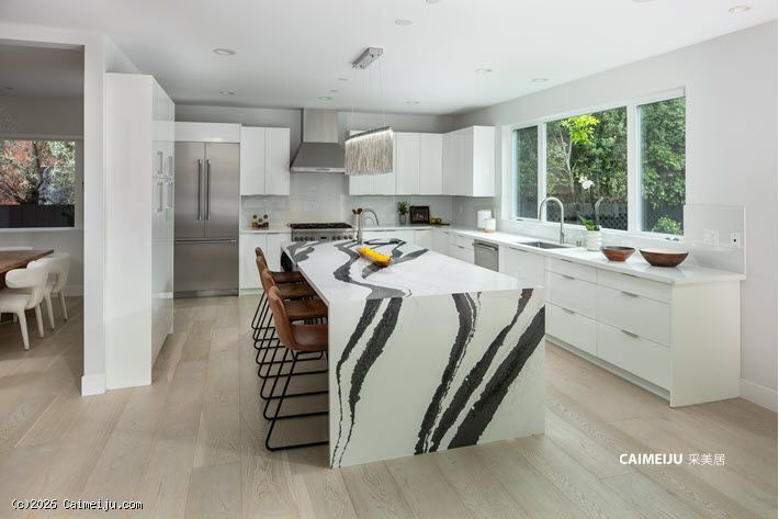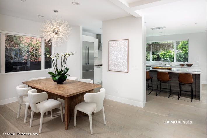 餐厅与开放式厨房及家庭厅相连,厨房配备 Thermador 家电、支持 WiFi 的冰箱与洗碗机、白色橱柜及石英石瀑布式岛台。家庭厅挑高约 12 英尺(约 3.7 米),配备高窗与壁炉,并通过玻璃门通往私密庭院,庭院设有露台与草坪。
