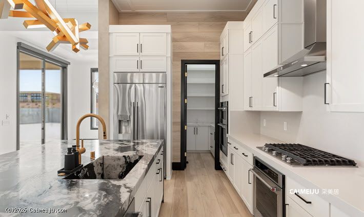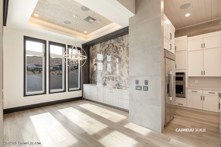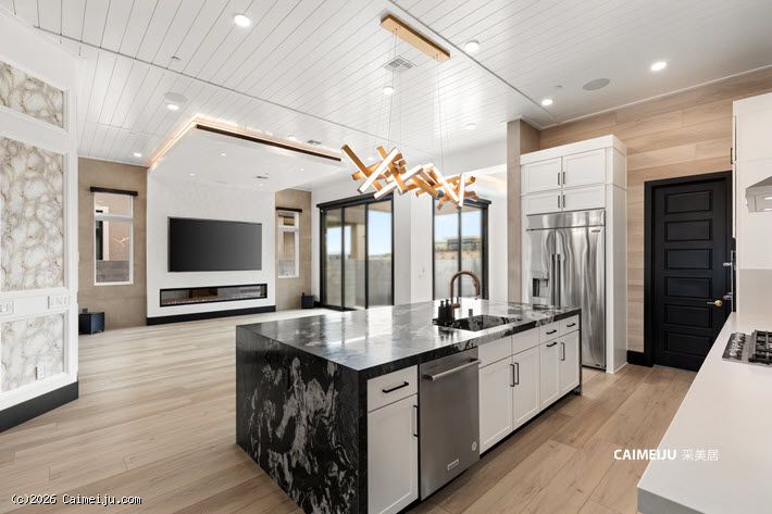 这座单层平层宅邸坐落于 Ascension 内备受推崇的 Incline Collection 尊贵私密社区,24 小时礼宾级安保,营造出安心从容的高端居住氛围。室内选材考究,通铺高品质耐磨木地板,搭配人字拼瓷砖细节,厨房以一整块皮革纹理石英岩中岛为视觉与功能核心,尽显现代奢雅格调。