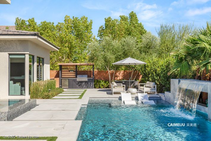户外空间如同私人度假胜地,设有泳池、水疗池、户外厨房及多个休闲区,在沙漠夜空下尽享惬意时光。