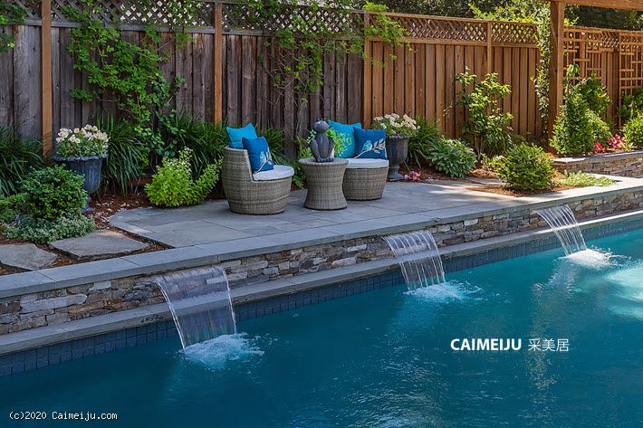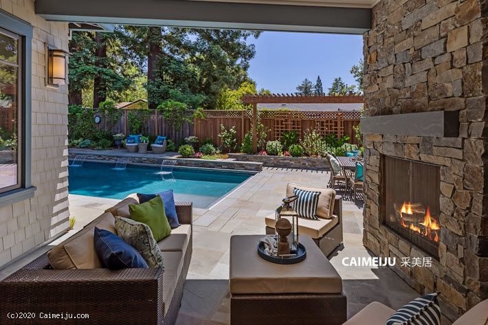 - 绝佳的后院中有铺青石的天井、室外燃气壁炉、泳池和水疗池