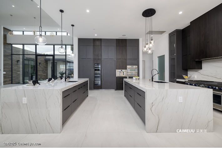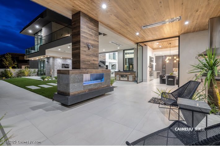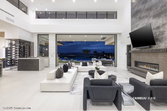 步入室内,挑高天花与壁炉主墙构成宏伟的会客厅,巨大的隐藏式玻璃门让室内外空间自然融合。厨师级厨房配备双石英岩瀑布岛台、Thermador 高端电器、恒温酒窖及可欣赏湖景的用餐区,让款待宾客变得轻松愉悦。户外则设有无边泳池、水疗池与户外厨房,夜晚的 LED 灯光映照水面,营造梦幻氛围。