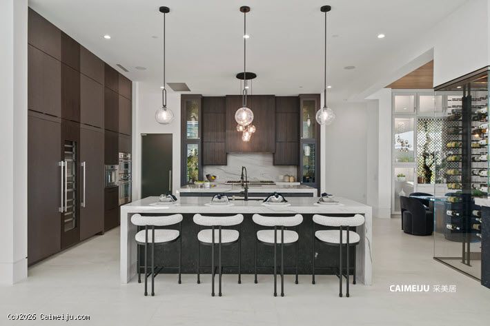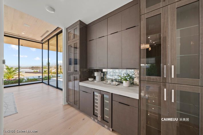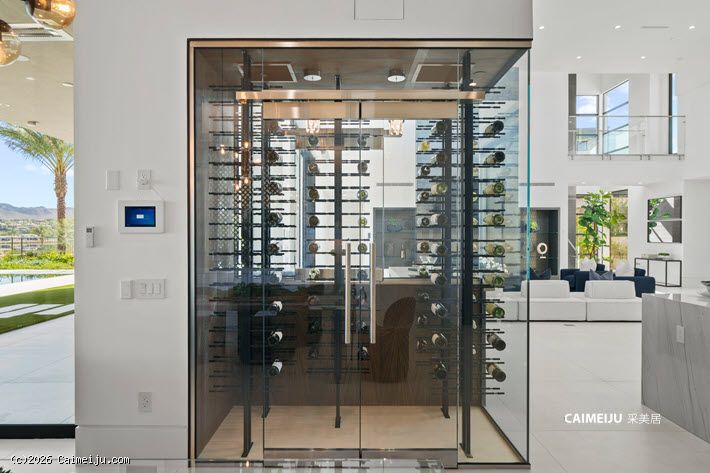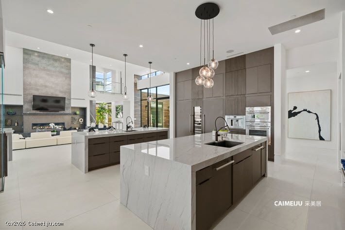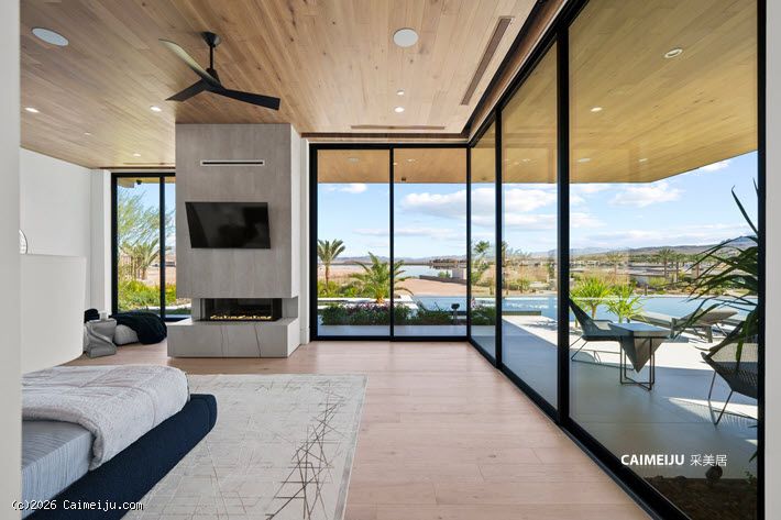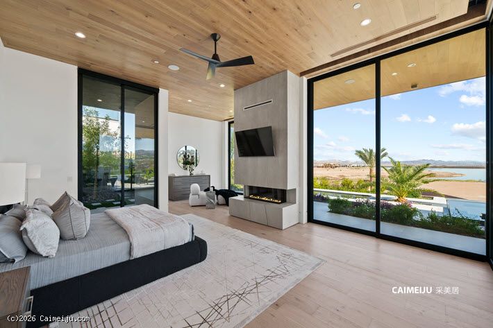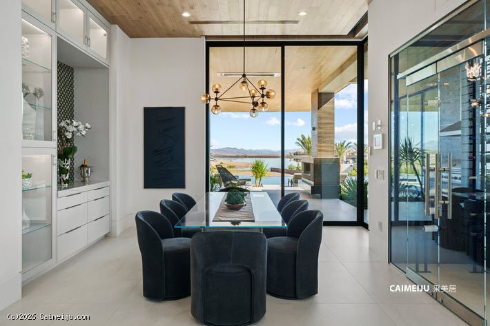 步入室内,挑高天花与壁炉主墙构成宏伟的会客厅,巨大的隐藏式玻璃门让室内外空间自然融合。厨师级厨房配备双石英岩瀑布岛台、Thermador 高端电器、恒温酒窖及可欣赏湖景的用餐区,让款待宾客变得轻松愉悦。户外则设有无边泳池、水疗池与户外厨房,夜晚的 LED 灯光映照水面,营造梦幻氛围。