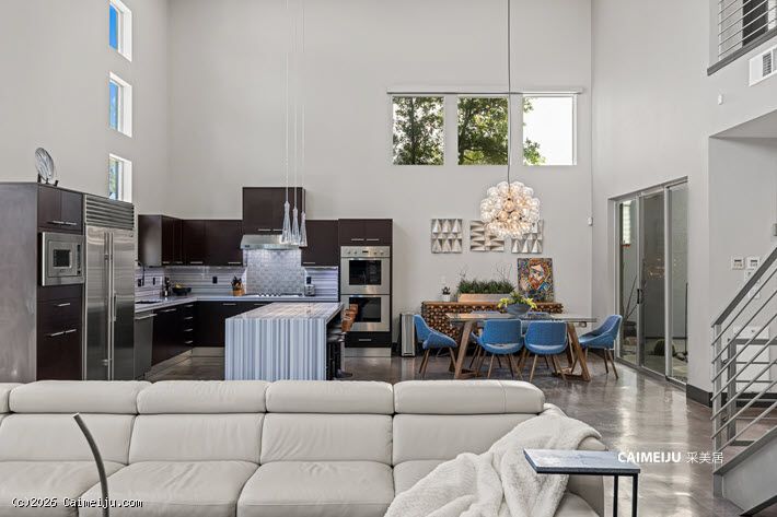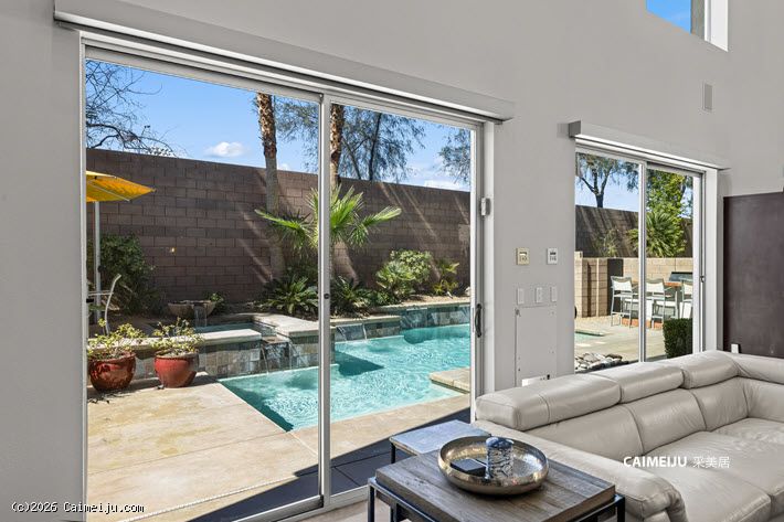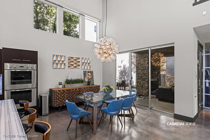 这座由 Blue Heron 打造的现代住宅位于 Summerlin 私密守卫社区内,以阁楼式设计呈现,强调室内外空间的自然融合。室内层高约 21 英尺(约 6.4 米),结合大面积窗景与滑动玻璃门,使空间通透开阔,并将自然光线充分引入。
