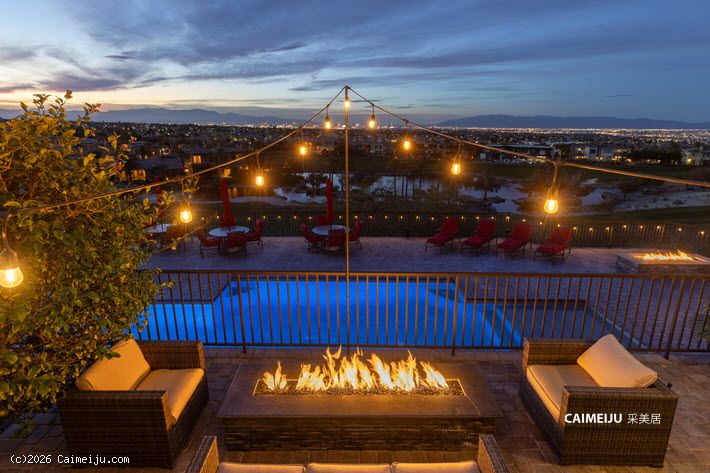 户外区域以度假氛围打造,后院设有缓坡入水式泳池、水疗池、内置烧烤区及多处壁炉,所有空间均围绕开阔的城市与山谷景观展开,适合举办聚会与社交活动。住宅同时配备 4 车位车库及可停放约 6 辆车的私家车道,满足多车位需求。
