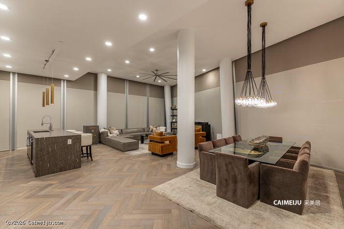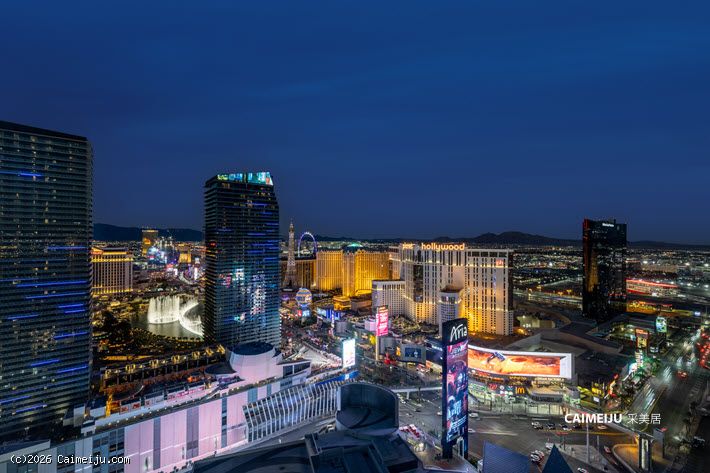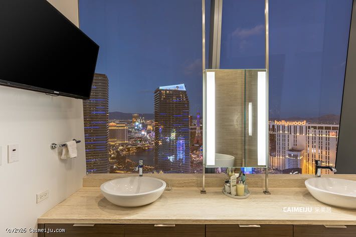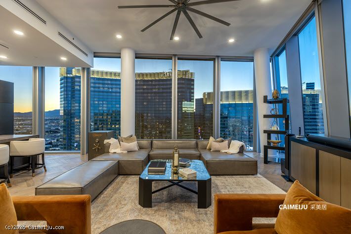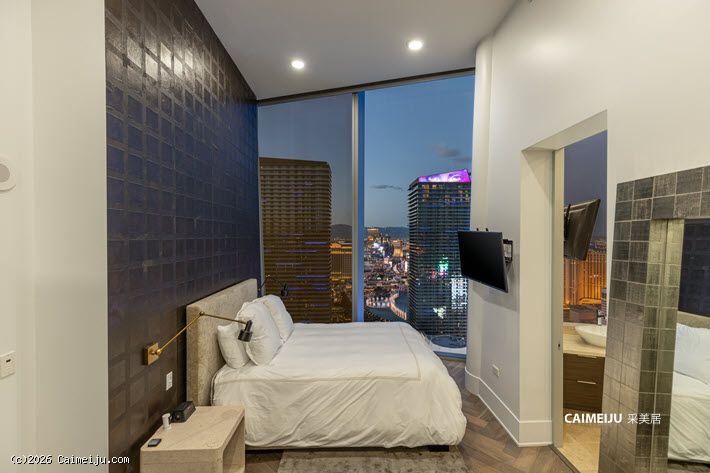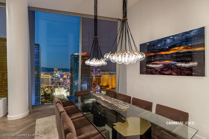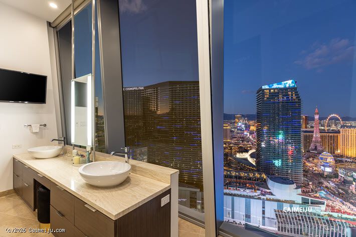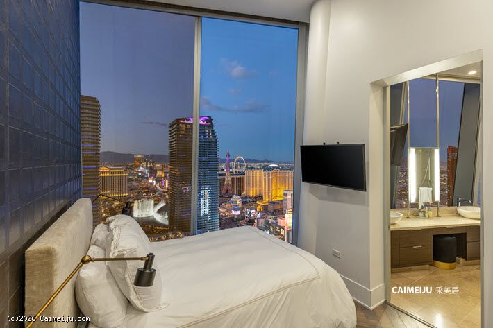 Veer Towers 3601W 顶层公寓坐落于大厦顶层,为两卧布局,坐拥拉斯维加斯大道核心景观。通过约 12 英尺(约 3.7 米)通高落地窗,可尽览 Bellagio 音乐喷泉、城市天际线及远山轮廓,同时可远眺 Paris Las Vegas 的 Eiffel Tower、The Linq、Hard Rock Guitar Hotel 以及 F1 赛道沿线景观,多重地标尽收眼底。