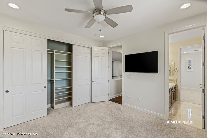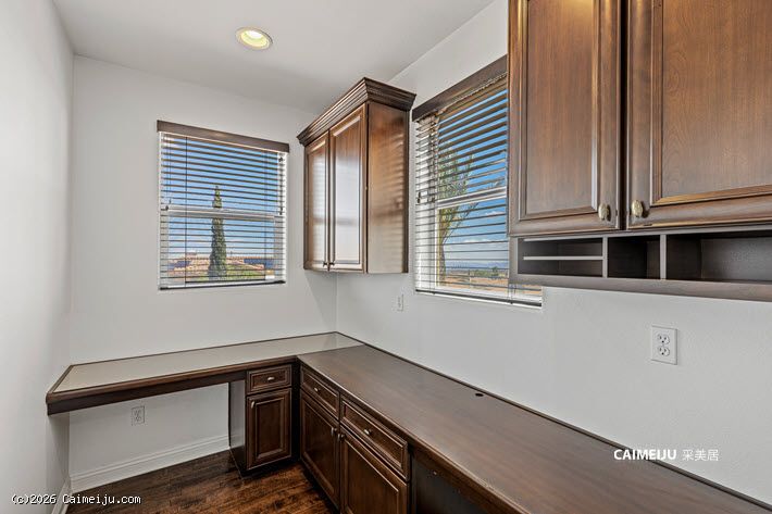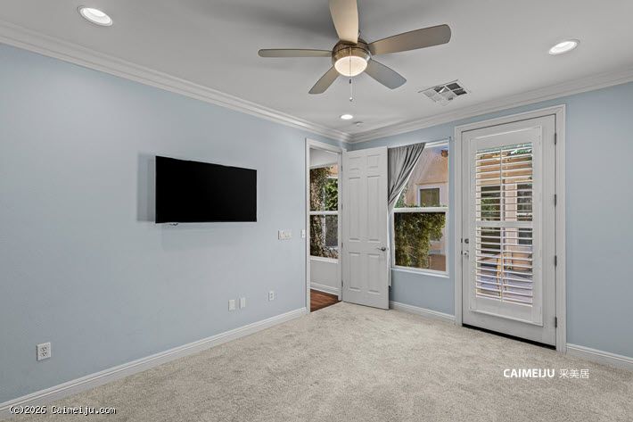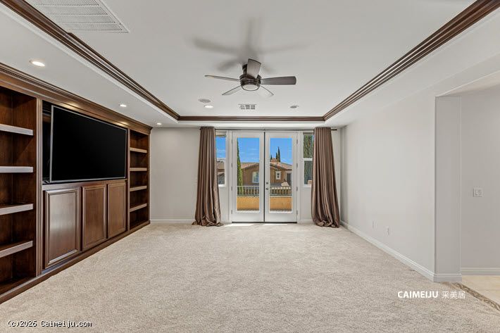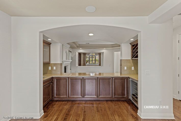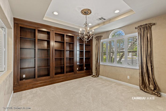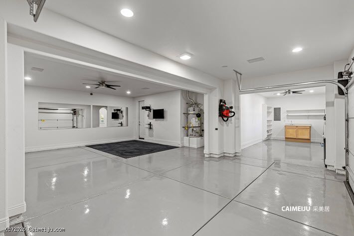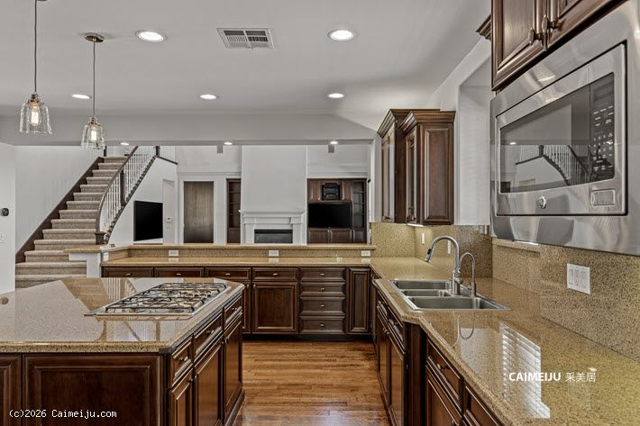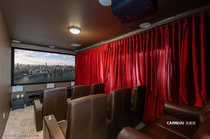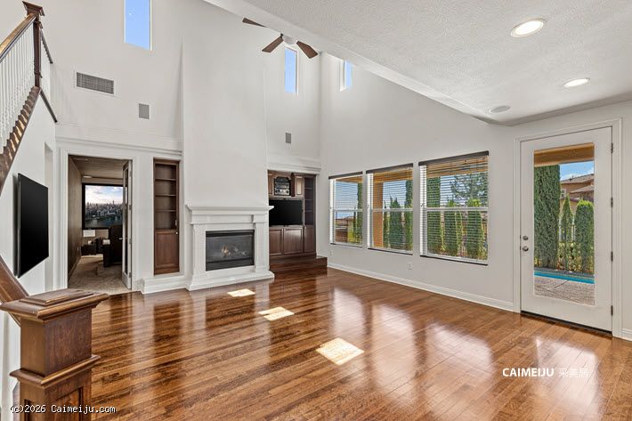 住宅配备加长车道与扩展车库,内部布局灵活,设有 4 间卧室,并包含影音室、书房、阁楼式图书空间及手工创作区。主要生活区域铺设硬木地板,并集成智能系统,包括 Alexa 控制的环绕音响及户外音响系统。