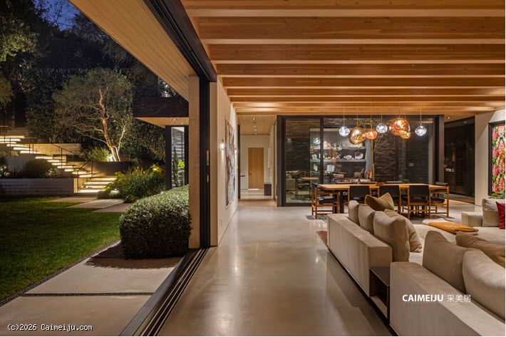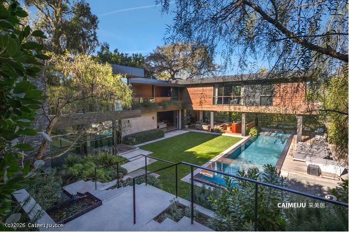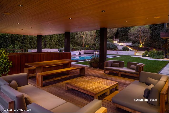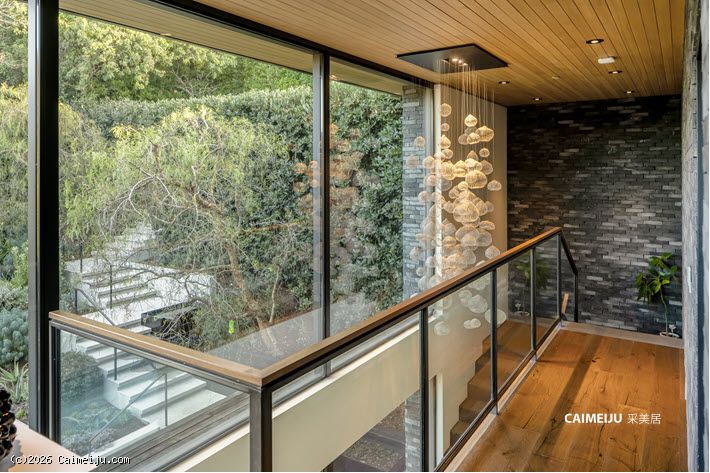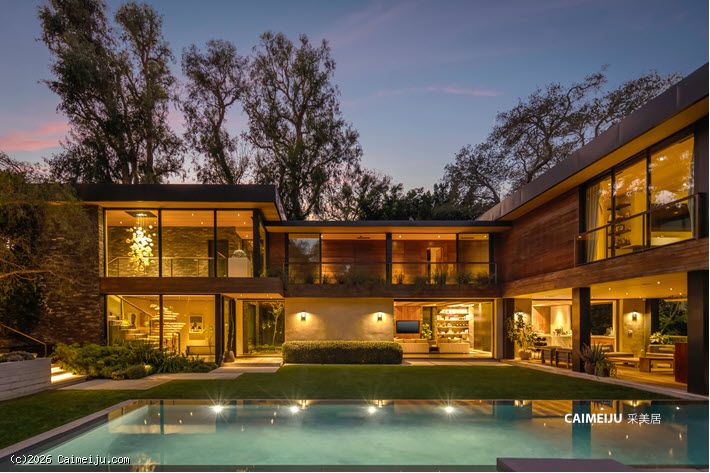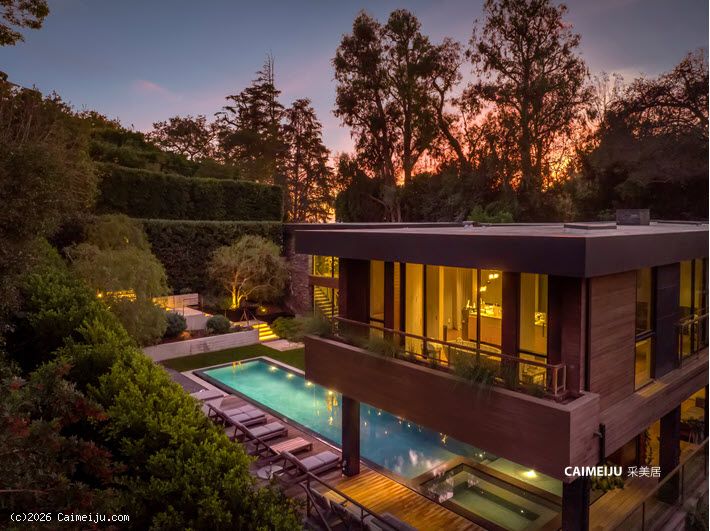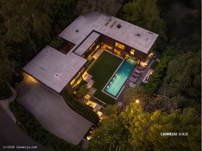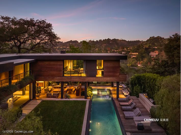 这座由 Simo Design 倾心打造的现代建筑杰作坐落于比佛利山庄著名的 Oak Pass Road 尊贵私密社区。住宅建筑面积约 5442 平方英尺,采用 3 卧 5 卫的 L 形建筑动线,将木材、石材、玻璃与火元素巧妙融合,与周围的峡谷及山坡景观自然相连。