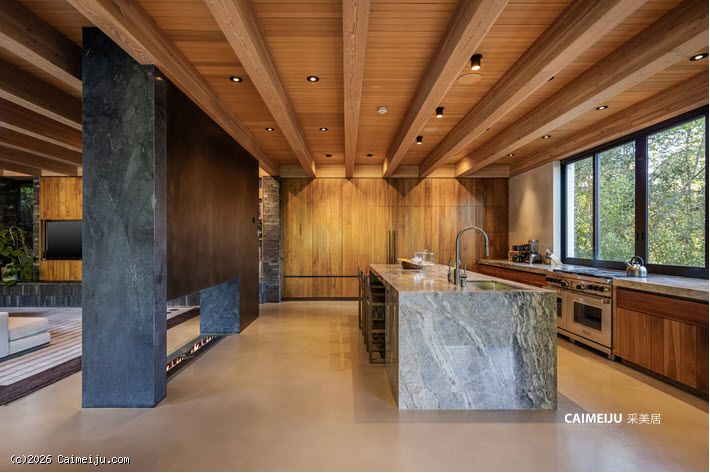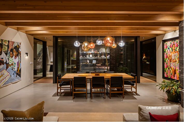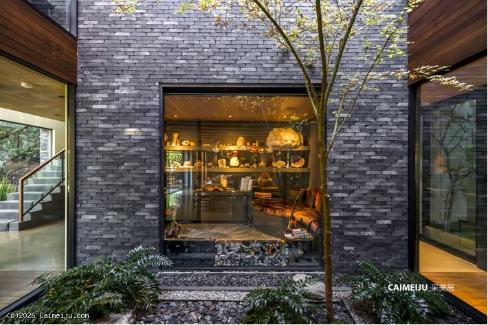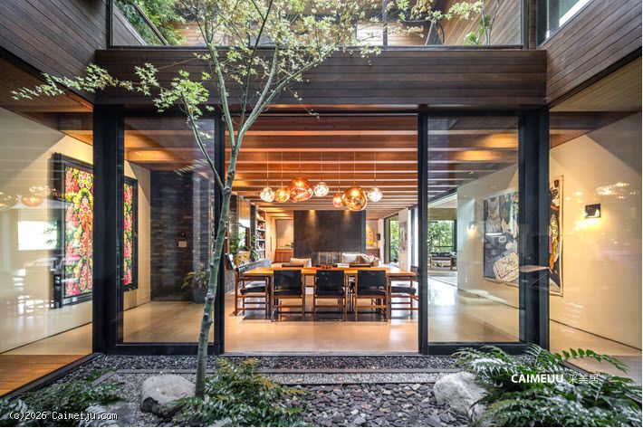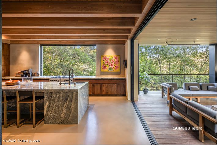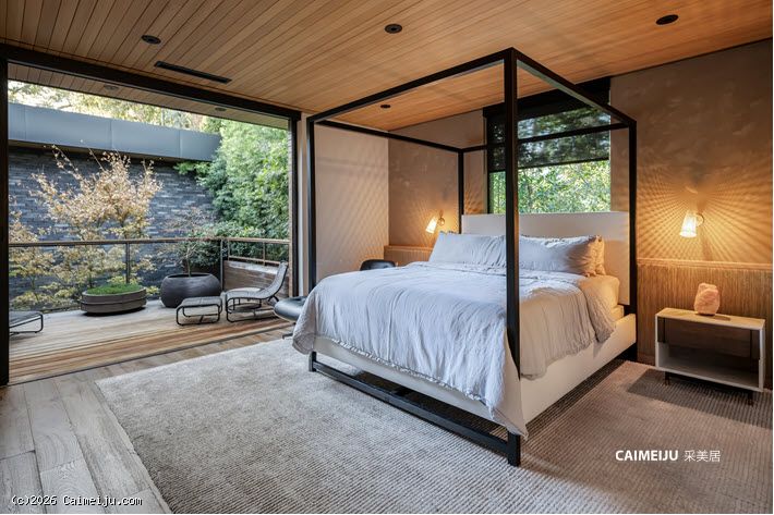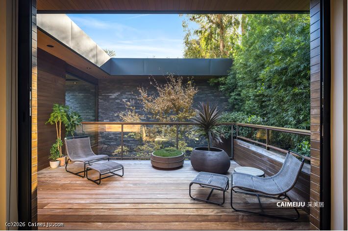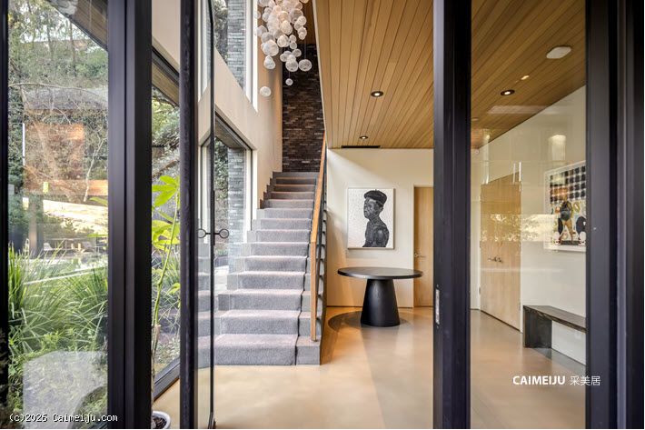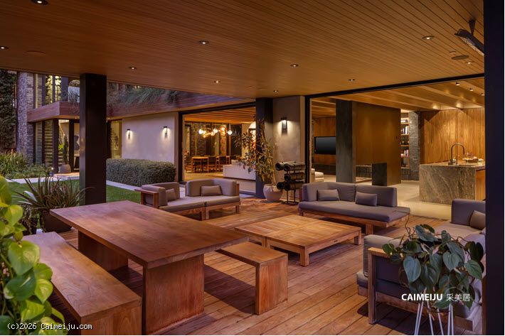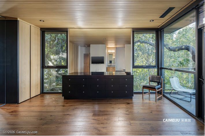 极具视觉张力的双层挑高中庭是住宅的核心空间,充足的自然光倾泻而入,点缀其中的悬空花园营造出灵动且富有层次感的居住氛围。开放式起居区与顶级厨房无缝衔接,厨房配备双面壁炉并直通户外休闲区,实现了室内外生活的流畅过渡。主卧套房悬浮于盐水无边泳池之上,视野开阔且私密安静,另外两间客卧套房则掩映于古老橡树之下,更显静谧独立。